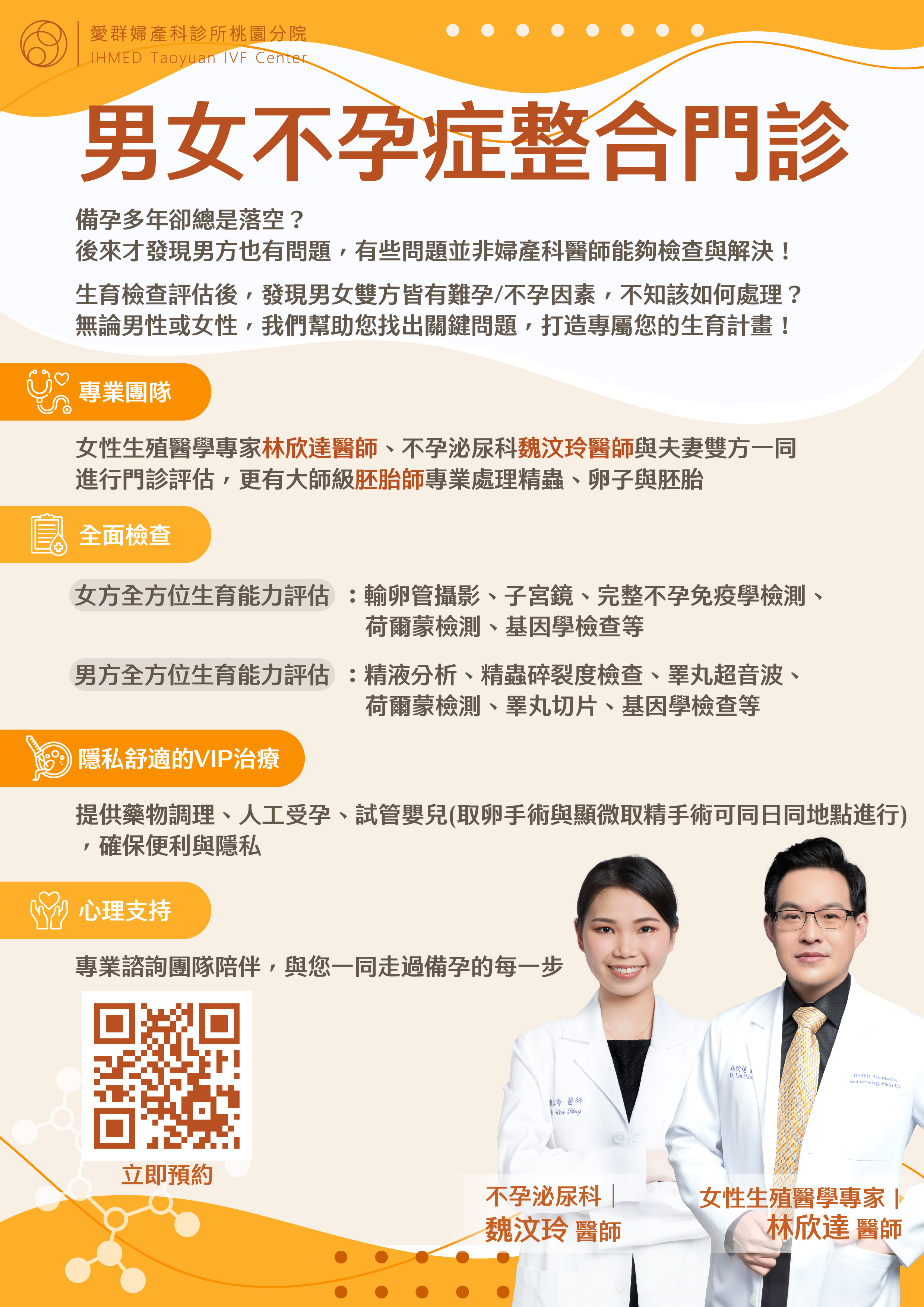 或加入官方LINE ID:@721iqvuh,預約「男女整合門診」,愛群桃園櫃檯將協助雙方掛號。